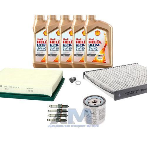 Состав набора ТО: Масло моторное Shell Helix 5W40 (допуск 502/505)- 4 л.Фильтр масляный 04E115561H- 1 шт.Фильтр воздушный 04E129620A- 1 шт.Фильтр салонный 6R0819653- 1 шт.Пробка масляного поддона N90288901 + кольцо N0138157- 1 шт.
