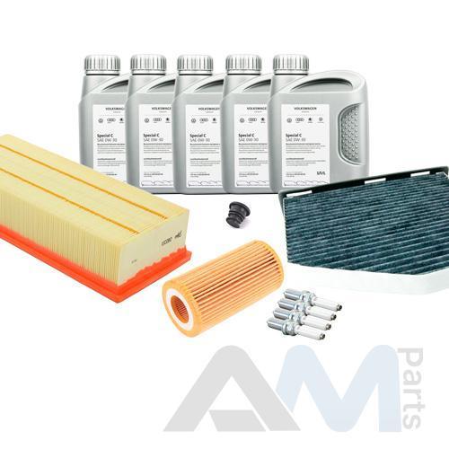 Состав набора ТО: Оригинальное моторное масло VAG- Special G 5W40 (допуск 502/505)- 5 л. Оригинальный масляный фильтр 06L115562B- 1 шт. Оригинальный воздушный фильтр 5C0129620- 1 шт. Оригинальный салонный фильтр JZW819653B- 1 шт. Пробка масляного поддона N91167901 + кольцо N0138157- 1 шт. Оригинальные свечи зажигания 06K905601B- 4 шт.