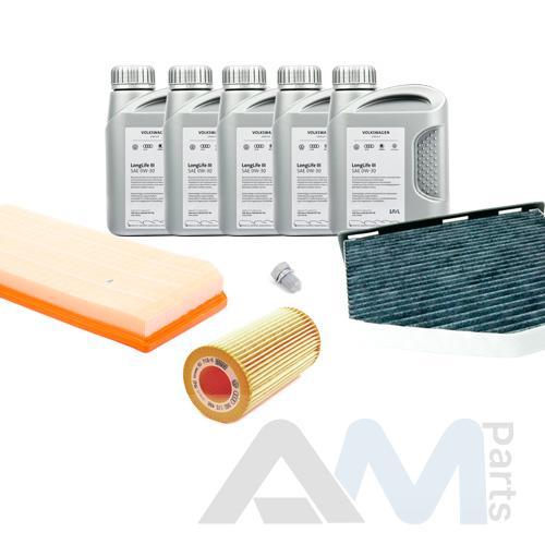 Состав набора ТО: Оригинальное моторное масло VAG Long Life III (504/507)- 5 л.Оригинальный масляный фильтр 06D115562- 1 шт.Оригинальный воздушный фильтр 06F133843B- 1 шт.Оригинальный салонный фильтр JZW819653B- 1 шт.Пробка масляного поддона N90813202- 1 шт.Оригинальные свечи зажигания 06H905601A- шт.