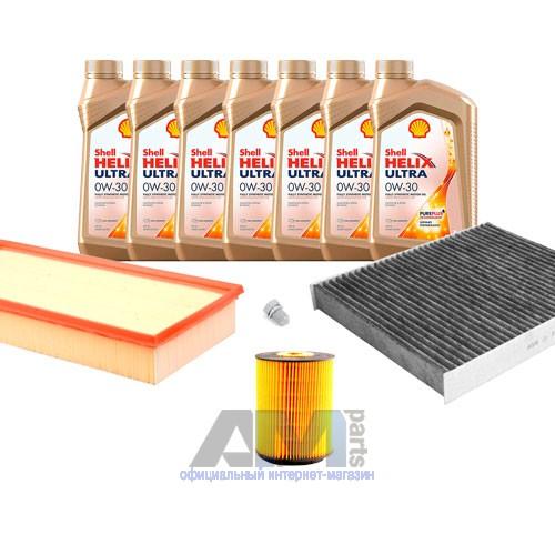 Состав набора ТО: Масло моторное Shell Helix 0W30 (допуск 502/505 или AV-L 504/507) - 7 л.Фильтр масляный 021115562A- 1 шт.Фильтр воздушный 7L0129620- 1 шт.Фильтр салона угольный 7H0819631A- 1 шт.Пробка масляного поддона N90813202- 1 шт.Свечи зажигания 101905606A- 6 шт.