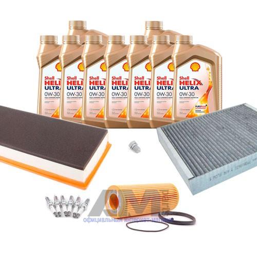 Состав набора ТО: Масло моторное Shell Helix 0W30 (допуск 502/505 или AV-L 504/507) - 9 л.Фильтр масляный 06E115562A- 1 шт.Фильтр воздушный 7P0129620A- 1 шт.Фильтр салона угольный 7P0819631- 1 шт.Пробка масляного поддона N0160276 + кольцо N0138157- 1 шт.
