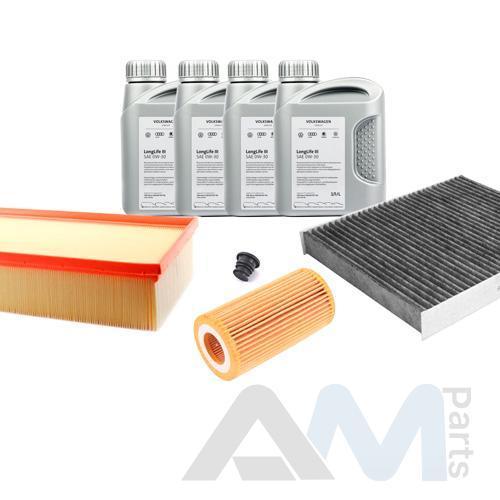 Состав набора ТО: Оригинальное моторное масло VAG Long Life III (504/507)- 4 л.Оригинальный масляный фильтр 06L115562B- 1 шт.Оригинальный воздушный фильтр 5Q0129620B- 1 шт.Оригинальный угольный фильтр салона- 1 шт.Пробка масляного поддона 06L103801- 1 шт.Оригинальные свечи зажигания 06K905601B- 4 шт.