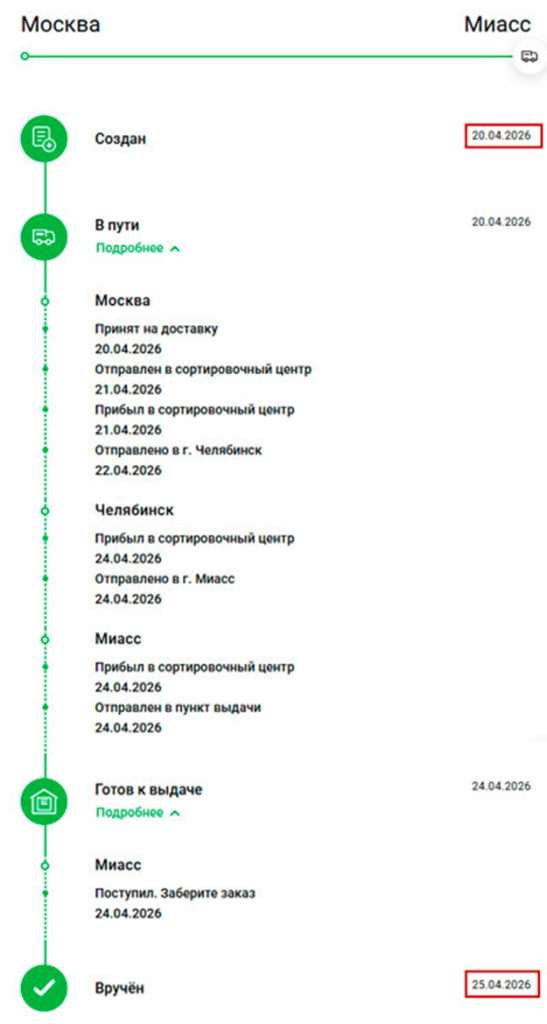 Ниже приведен скрин исполнения заказа в СДЭК от момента создания заказа до момента доставки посылки в пункт выдачи.