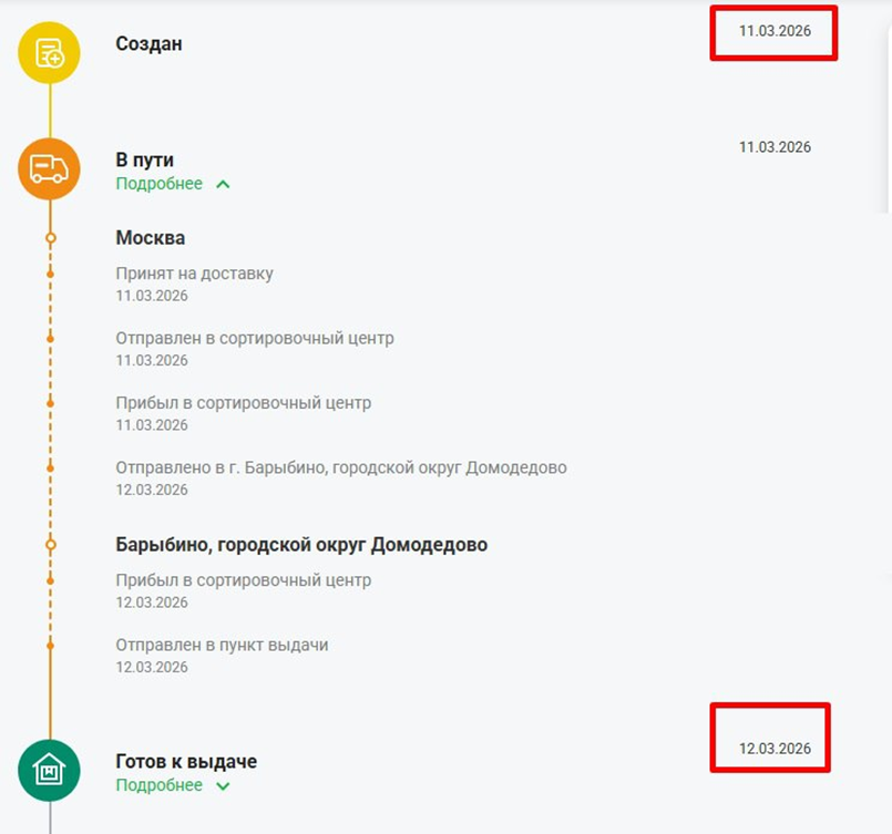Ниже приведен скрин исполнения заказа в СДЭК от момента создания заказа до момента доставки посылки в пункт выдачи.