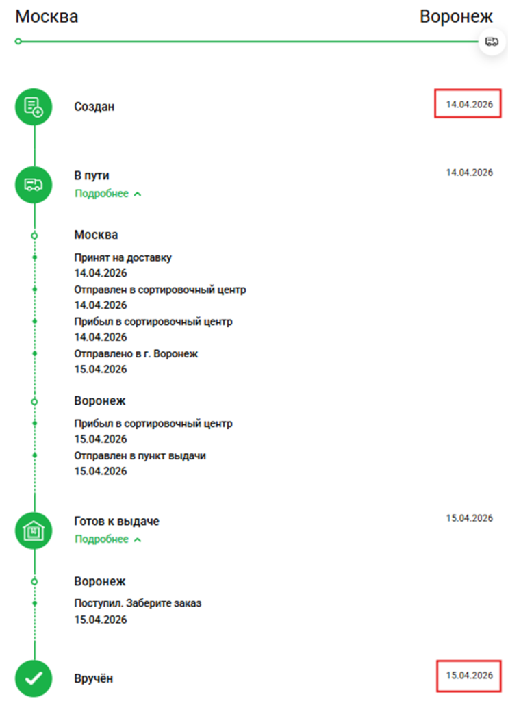 Ниже приведен скрин исполнения заказа в СДЭК от момента создания заказа до момента доставки посылки в пункт выдачи.